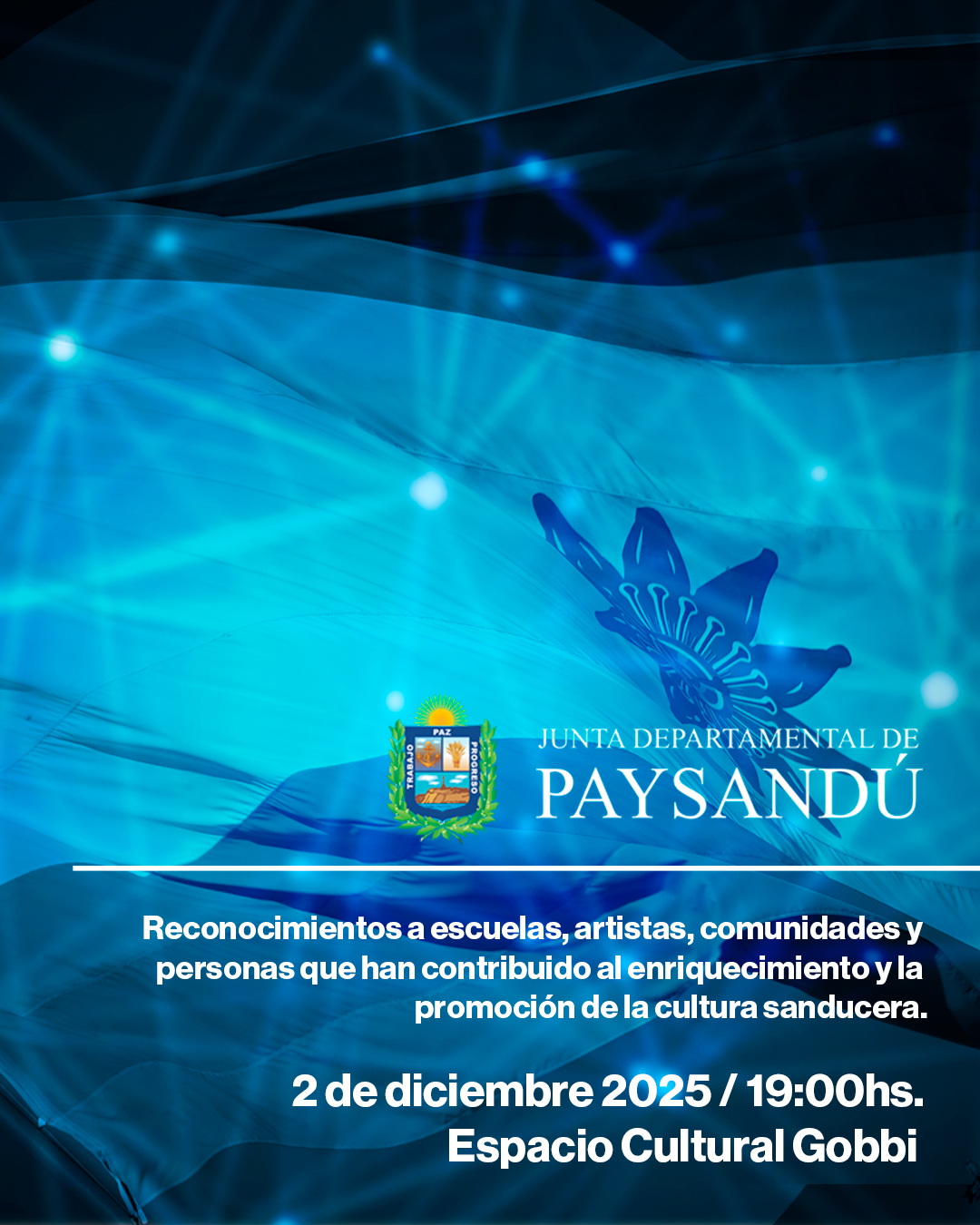 La Junta Departamental de Paysandú, a través de su Comisión de Cultura, tiene el agrado de invitar a usted al evento que se llevará a cabo el martes 2 de diciembre, a las 19:00 horas, en el Espacio Cultural Gobbi.