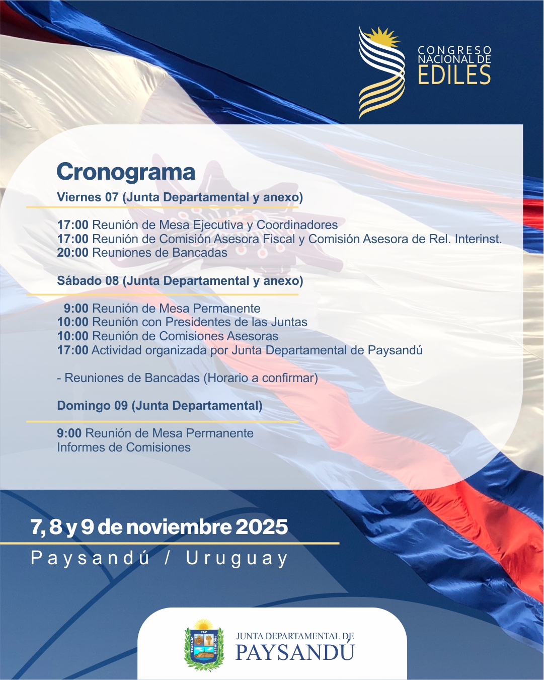 Tenemos el agrado de informar que la Junta Departamental de Paysandú será anfitriona del Encuentro del Congreso Nacional de Ediles.