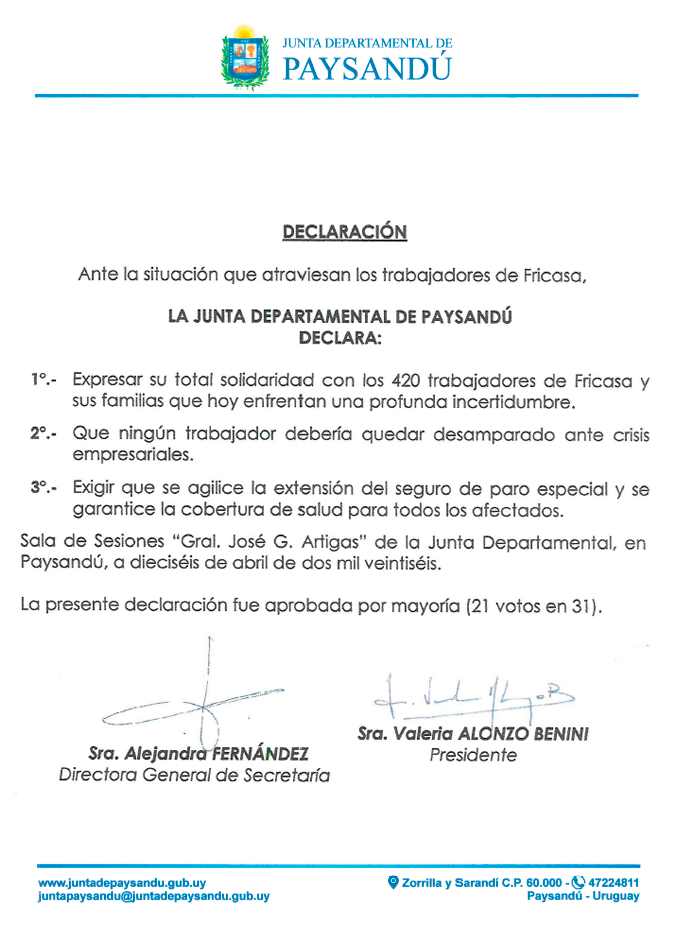 La Junta Departamental de Paysandú, en su sesión ordinaria del día 16 de abril del corriente, recibió en su plenario a funcionarios del Frigorifico Casa Blanca.